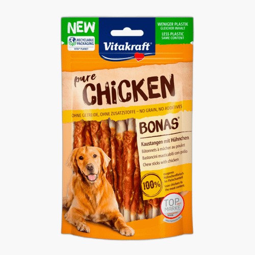 Die beliebten CHICKEN Bonas Kaustangen aus Rinderhaut sind mit viel herzhaftem Hühnchenfleisch ummantelt, schmecken dadurch unwiderstehlich gut und bringen Ihrem Vierbeiner zudem eine Extraportion Kauspaß. Natürlich in bester Qualität – ohne Zusatz von Zucker, Soja, Getreide, Ei, Milchprodukten und Fleischmehlen! Auch auf alle Zusatzstoffe, von Konservierungsmitteln bis hin zu Geschmacksverstärkern, wird bei der Herstellung konsequent verzichtet.Neue nachhaltige Verpackung: Weniger Plastik, gleicher Inhalt! Verpackt sind die raffinierten Kaustangen im wiederverschließbaren Beutel aus recyclingfähigem Material. Dabei ist die Beutelgröße ideal an die Inhaltsmenge angepasst, um unnötiges Plastik zu vermeiden. Genuss mit bestem Gewissen!